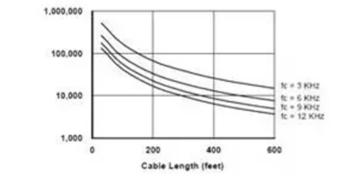 变频器的载波频率越高,输出电流波形越接近正弦波,这会降低电机的运行温度,从而延长绝缘的寿命。但是,更高的载波频率意味着每秒钟产生的尖峰电压数量更多,对电机的冲击的次数更多。图4给出了绝缘寿命随着电缆长度与载波频率的变化。从图中可知,对于200英尺长的电缆,当载波频率从3kHz提高到12kHz(变化4倍)时,绝缘的寿命从大约8万小时降低到2万小时(相差4倍)。
